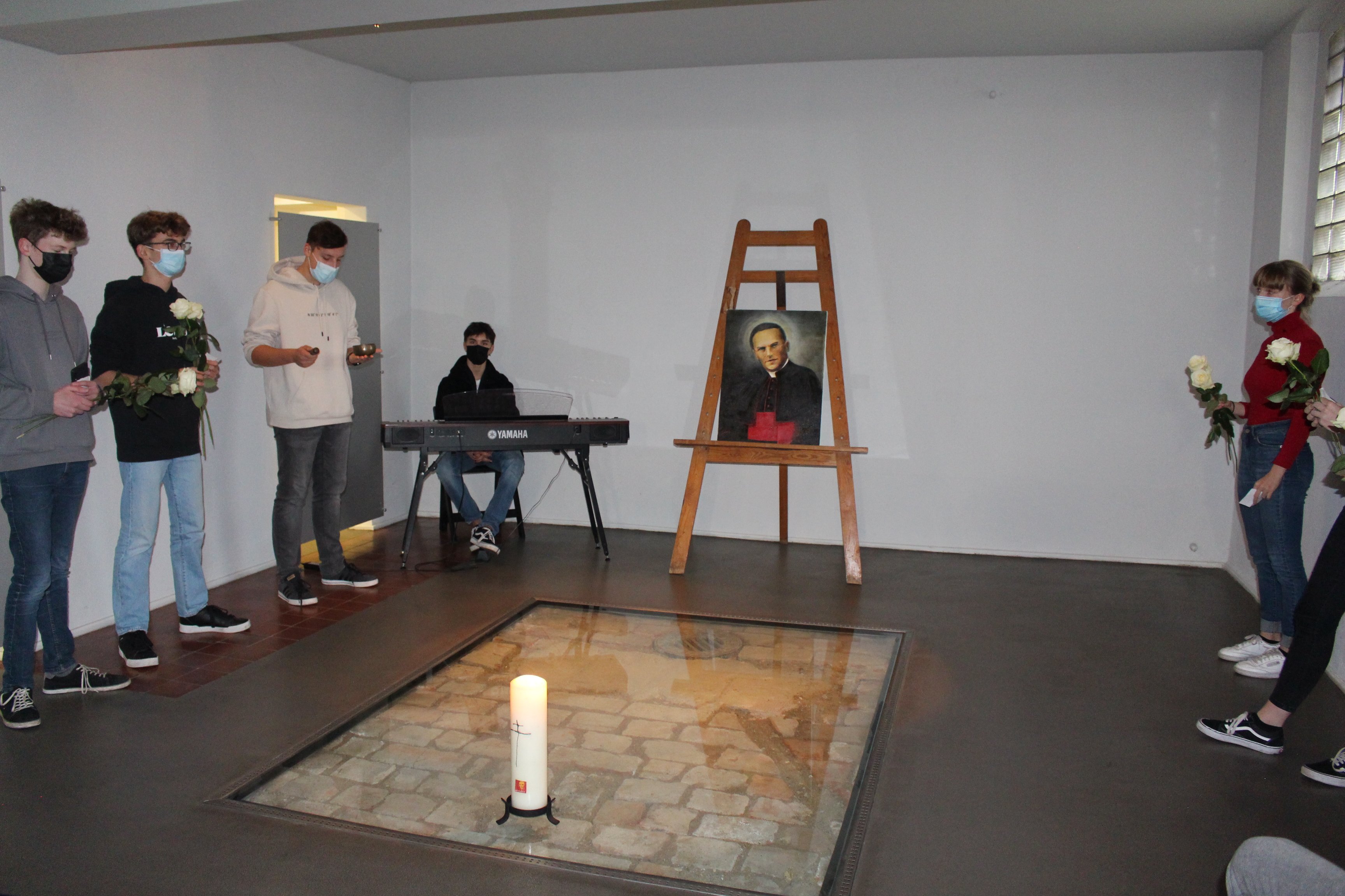 Der Hauptteil des Gottesdienstes fand im Raum der Hinrichtung statt. Zu Beginn schufen wir einen Moment der Stille und Besinnung, welcher aus dem mehrmaligen Anschlagen einer Klangschale bestand. Im Anschluss wurden die Namen und Umstände der am 13.11.1944 Hingerichteten vorgelesen, wobei wir für jede Person eine Rose auf die Glasscheibe, die die frühere Hinrichtungsstelle markiert, niederlegten. Daraufhin gingen wir zu dem Lesen des Abschiedsbriefes, welchen Carl Lampert in seinen letzten Stunden verfasste, über, worauf eine modernisierte Version eines solchen Briefes folgte.