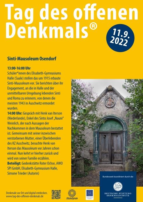 Die Klasse 10 d des Elisabeth-Gymnasiums engagiert sich am Tag des offenen Denkmals. Am Sonntag, den 11. September 2022, ab 13.00 Uhr stellen unsere Schülerinnen und Schüler die Geschichte des Sinti-Mausoleums in Osendorf vor. Interessierte Bürgerinnen und Bürger sind herzlich eingeladen, das historische Bauwerk in Halles Süden von unseren Schülerinnen und Schülern vorgestellt zu bekommen. Während einiger Projekttage untersuchte die Klasse zuvor wie Sinti und Roma in Halle lebten und wie sie in der Zeit des Nationalsozialismus verfolgt, ghettoisiert, deportiert und ermordet wurden. Auch von den Einsichten in Lebensläufe und Lebensgeschichten möchten die Jugendlichen am Tag des Denkmals in Osendorf berichten. Mgb/SHU
