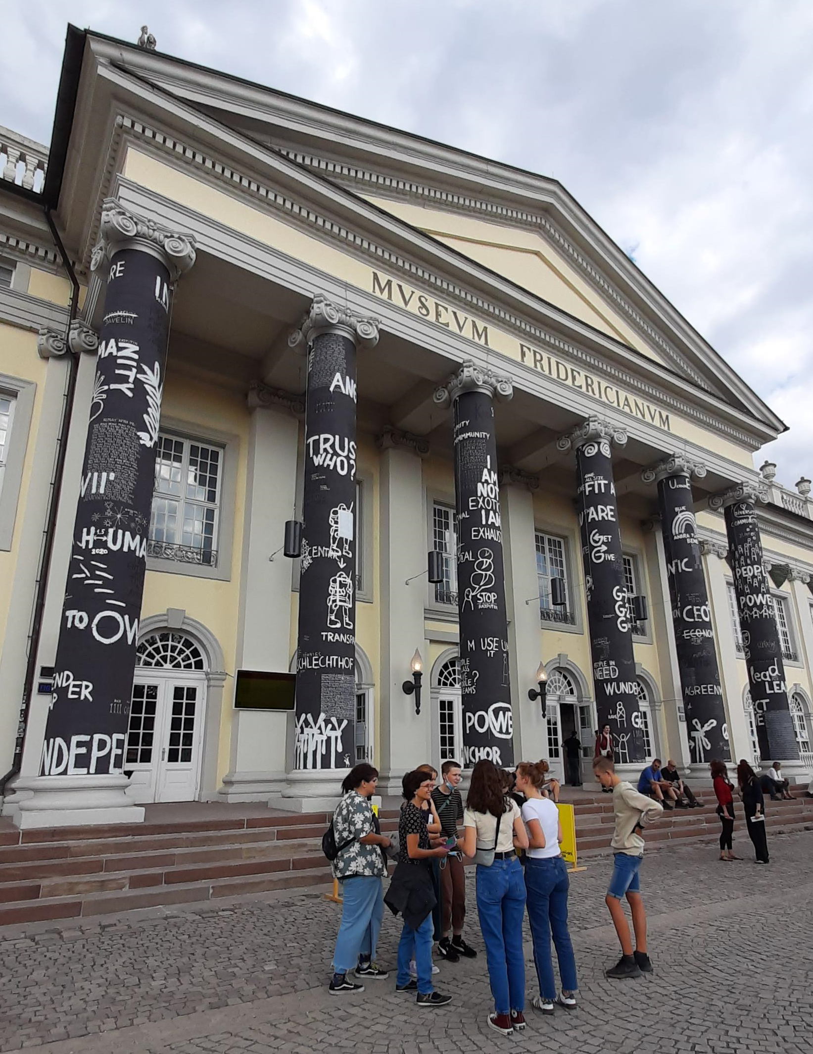 Als Gruppe machten wir uns auf den Weg, verschiedene Ausstellungsorte zunächst in der Innenstadt (Fridericianum, documenta Halle, Karlswiese) danach an der Fulda (Bootsverleih Ahoi) zu sehen. An einem Standort angelangt, hatte jede und jeder Zeit, sich mit dem auseinanderzusetzen, was ihn nun umgab. Selten waren alle pünktlich zurück. Denn es gab viel zu entdecken.