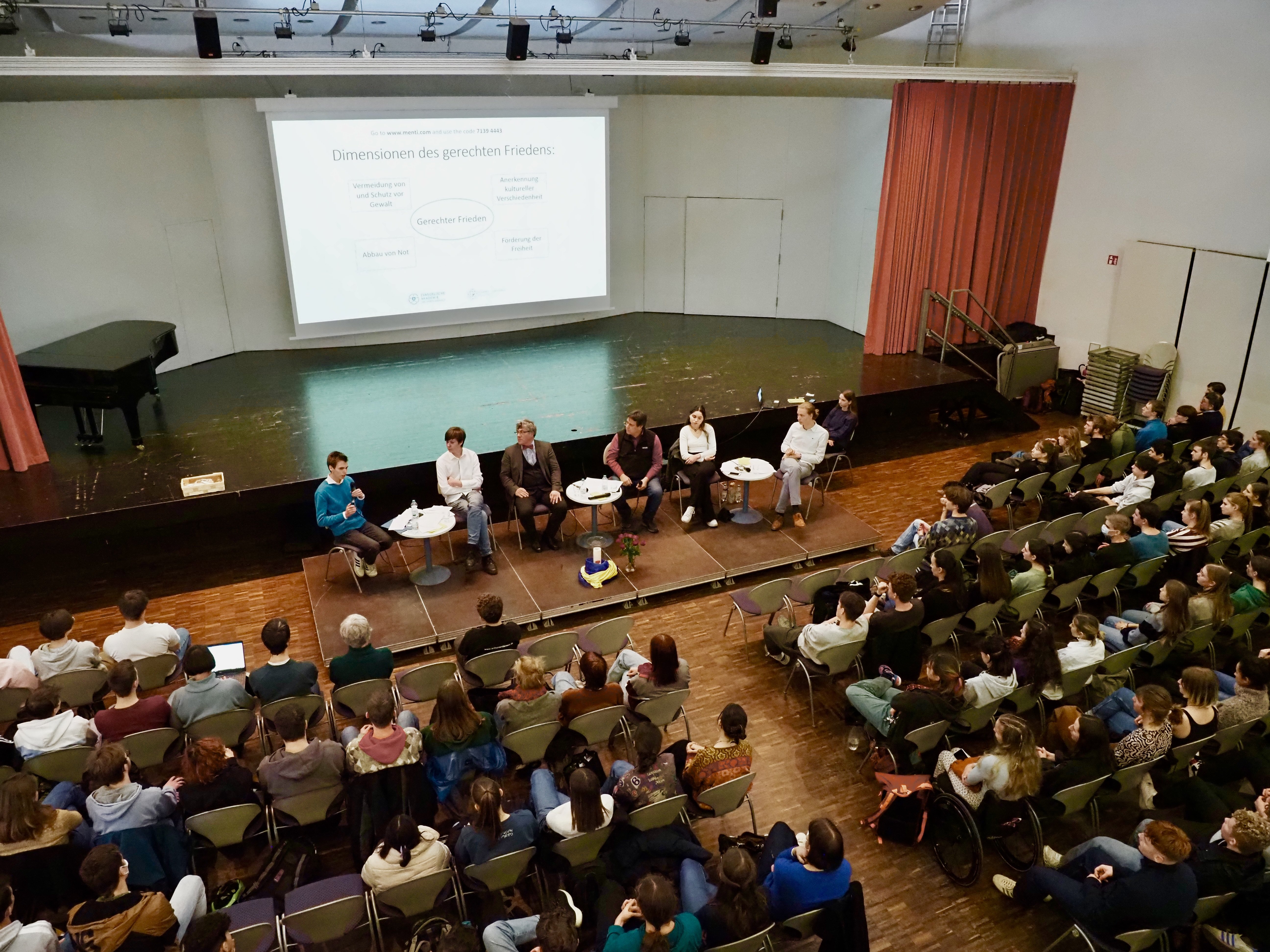 An der Diskussion nahmen fast 300 Schüler:innen aus den 10., 11. und 12. Klassen teil, die der fast zweistündigen Diskussion engagiert und auch emotional involviert folgten und sich per Mentimeter und mit Redebeiträgen einbrachten.