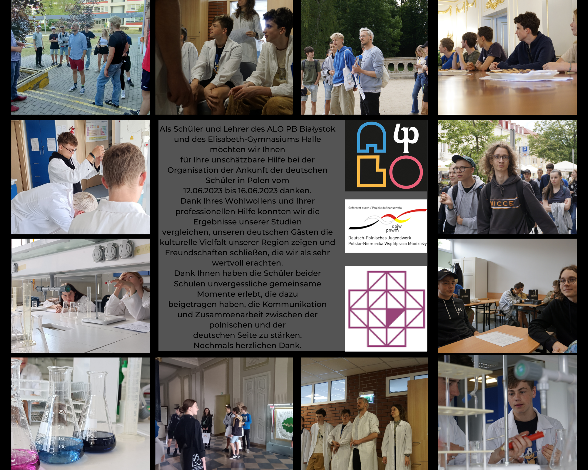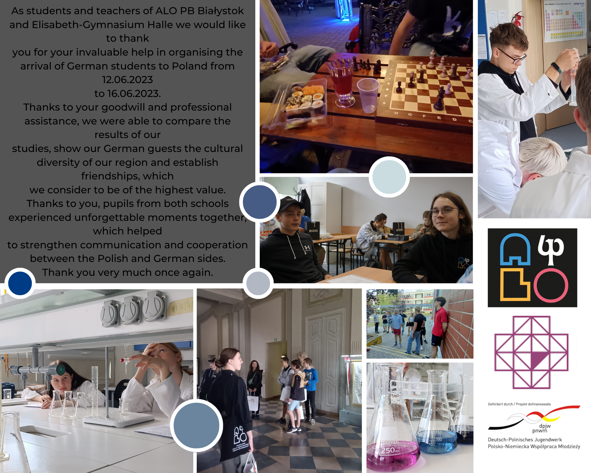 Seit dem Schuljahr 2021/2022 unterhalten wir ein hybrides Austauschprojekt mit einem polnischen Lyzeum in Bialystok im Osten des Landes. Gefördert vom Deutsch-Polnischen Jugendwerk können 15 interessierte Schülerinnen und Schüler im VNU-Aufbaukurs der Klasse 9 gemeinsam mit 15 polnischen Schülerinnen und Schülern ein selbstgewähltes Projekt erarbeiten und experimentell stützen. Synchrone online-Phasen wechseln sich mit asynchronem Unterricht ab und werden ergänzt um zwei Präsenzbegegnungen. Hier der Bericht von der Fahrt nach Bialystok