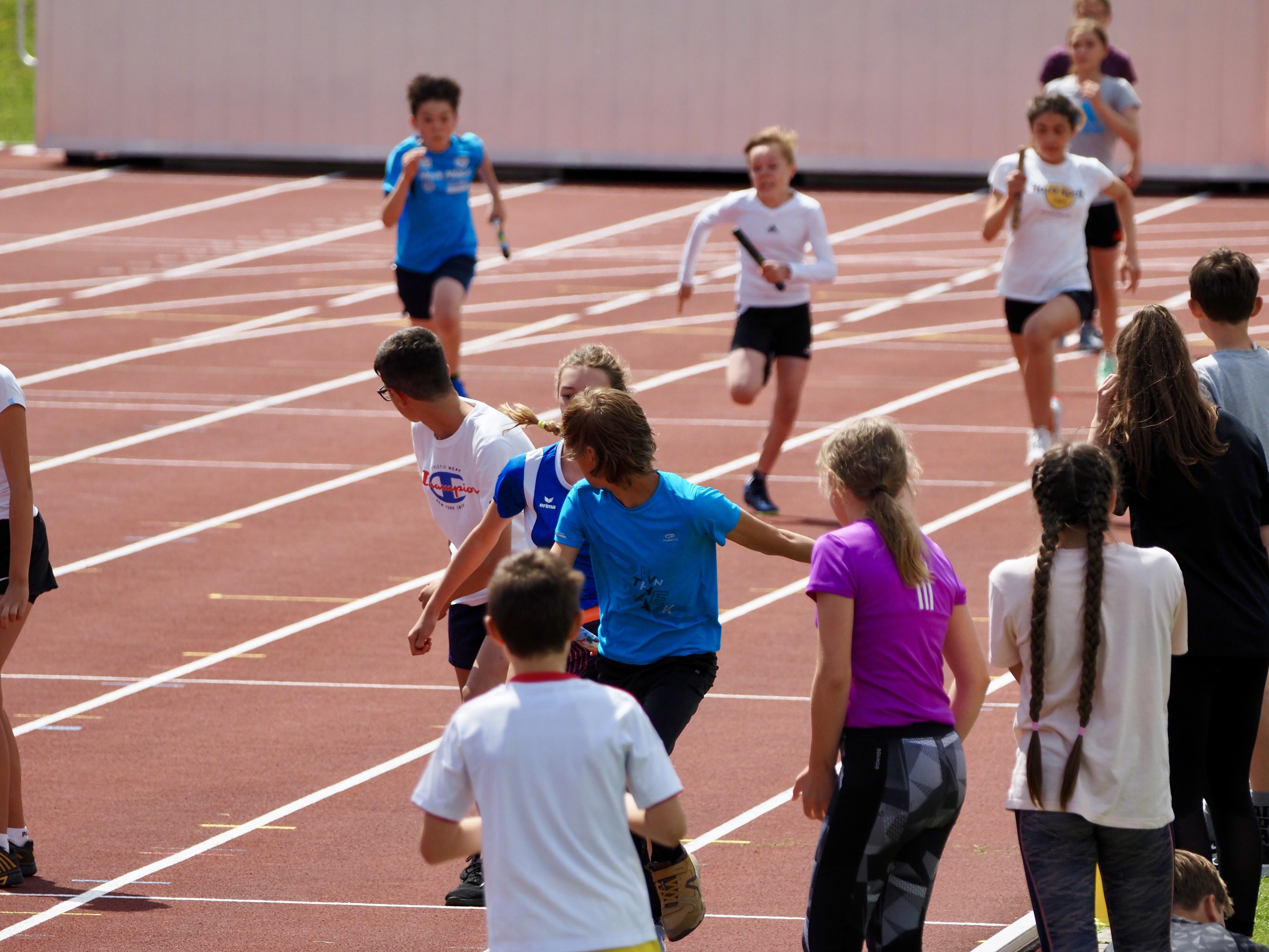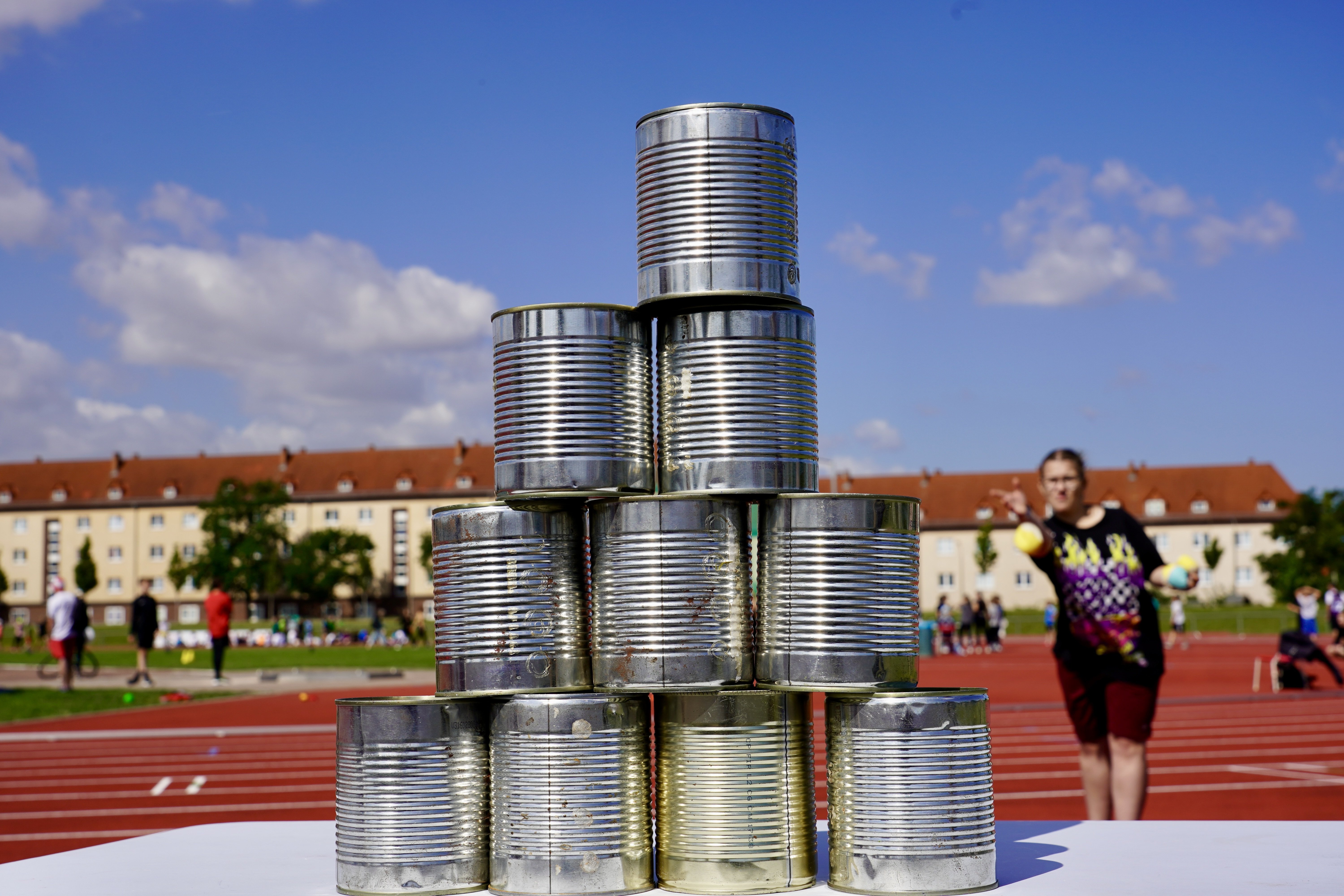 Während sich die Schüler:innen der Jahrgänge 5-7 neben dem Sprinten, Springen und Werfen auch im Zweifelderball und Brennball maßen, so erlebten die Schüler:innen der Jahrgänge 8-10 die klassischen Disziplinen der Leichtathletik mal anders – so zum Beispiel beim Slalom- und Huckepack-Laufen, beim Zielspringen und partnerschaftlichen Seilspringen, beim Fahrradreifen-Schleudern und Dosenwerfen sowie beim 45-minütigen paarweisen Ausdauerlaufen. Statt Einzelwertungen standen die Klassen im Vordergrund, sodass wir nach den abschließenden jahrgangsspezifischen und jahrgangsübergreifenden Staffelläufen, die jeweils besten Klassen der Jahrgänge ehren konnten. Für uns war das Sportfest – vergleichbar zu den Leistungen der Schüler:innen beim Dosenwerfen und FußballGOALf (Fotos: Danke an Martin Scheibe!) – ein Treffer, den wir insbesondere auch der Unterstützung unseres gesamten 11. und einigen Abiturient:innen des 12. Jahrgangs verdanken!