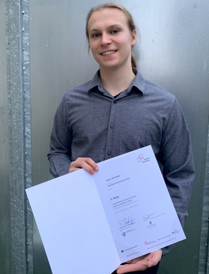 Zum Jugend-debattiert-Landeswettbewerb im Magdeburger Landtag am 26.2.24 fuhren Frieda Lorenz und Rosa Krannich im ICE. Sie hatten sich als jüngste Teilnehmerinnen ihrer Altersgruppe (Jg. 8 -9) qualifiziert und debattierten über die spannenden Fragen, ob die Auftrittslisten (“line-ups“) bei Musikfestivals geschlechterparitätisch besetzt werden sollen oder ob Chinesisch flächendeckend als Schulfach eingeführt werden soll. Während Frieda sich gut vorbereiten konnte, sprang Rosa als Nachrückerin ein und musste sich im Turbotempo warmlaufen. Für ihre engagierten Leistungen erhielten beide Schülerinnen Urkunden und Buchgeschenke.