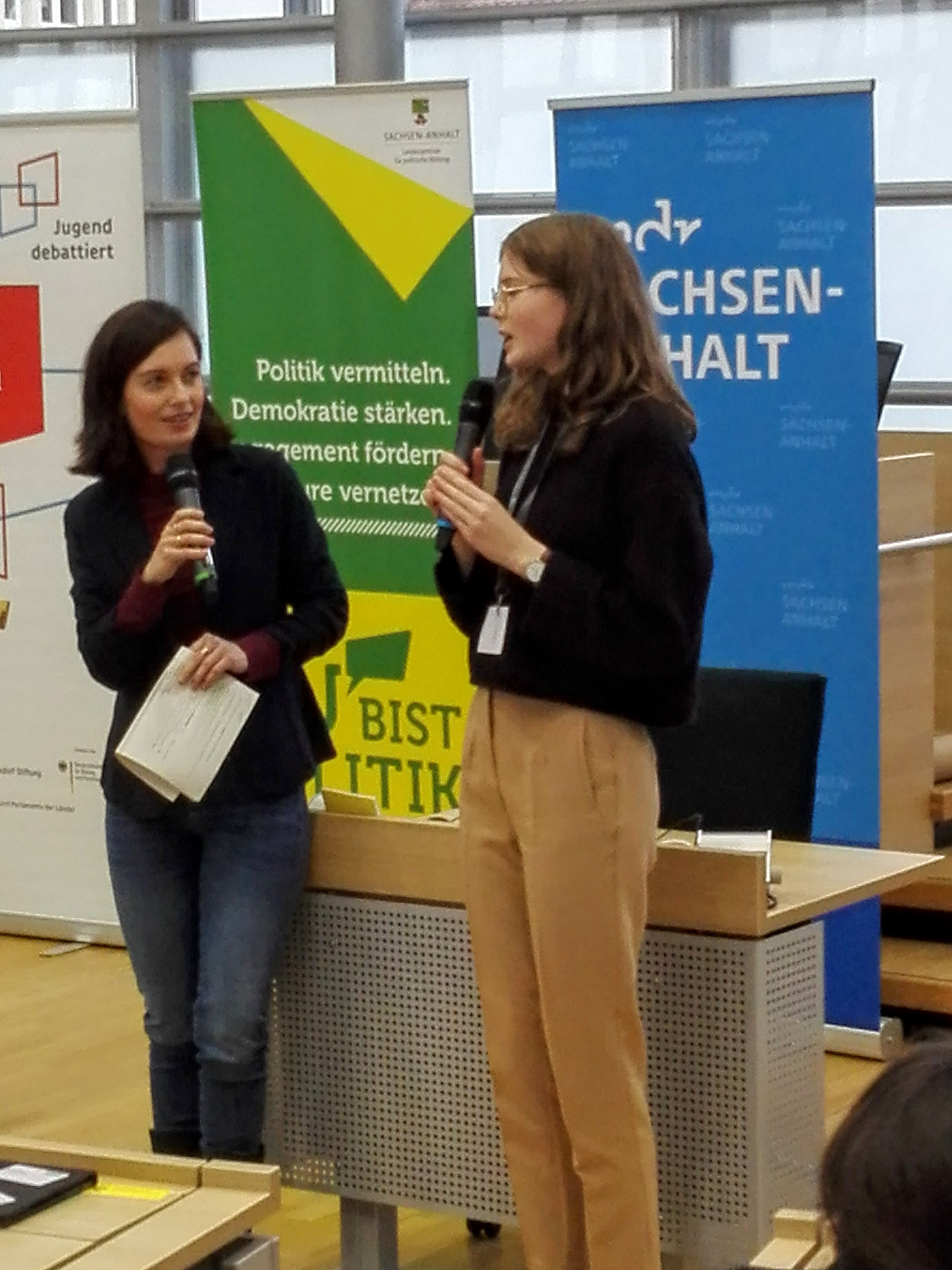 Mit Johanna Guse (Jg. 12) und Gregor Litwinenko (Jg. 11) befanden sich auch zwei ehemalige Landessieger in der Reisegruppe. Johanna berichtete der MDR-Moderatorin Janet Eger im Interview über ihre Erfahrungen beim letzten Bundeswettbewerb in Berlin und auch bei der Vorbereitung auf Burg Rothenfels im Spessart. Froh ist sie, viele Menschen neu kennengelernt zu haben, die ebenfalls Spaß am Debattieren finden.