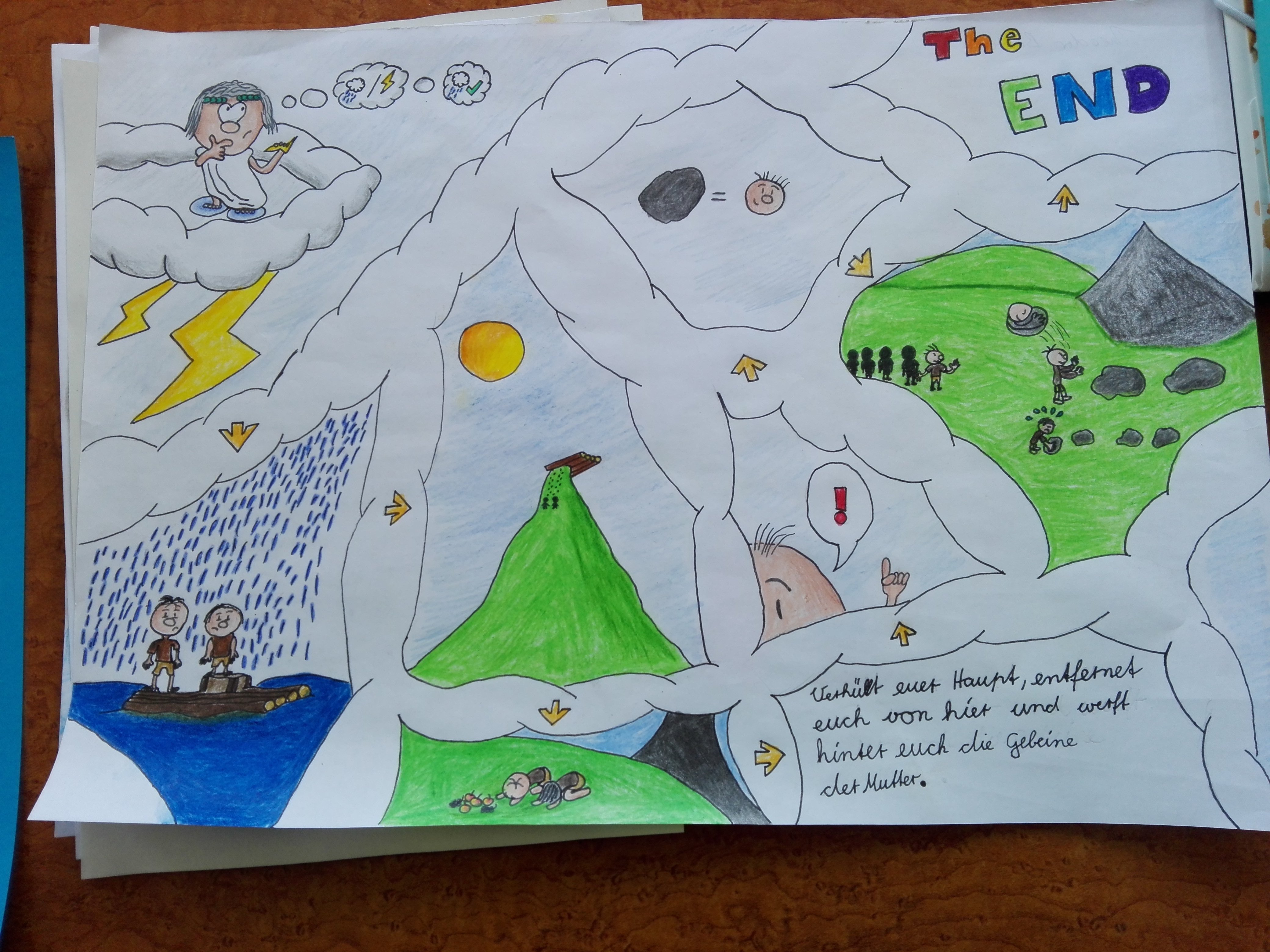 Im Wettbewerb der Mittelstufe (Jg. 9) erwarben Nelly Andra, Anna Mönicke, Anna Groth und Antonia Brand Anerkennungsurkunden - Thema war die bildliche Gestaltung der Gründungssage Roms -, in der Unterstufe Theodor Bartlitz, Anton Piller und Julia Oettler (Jg. 6). Die jüngsten Lateinschüler hatten die Aufgabe, Bilder zu zwei bedeutenden Mythen in Ovids „Metamorphosen“ zu malen: Jupiter schickt eine große Flut. Als einzige überleben Deukalion und Pyrrha, die durch das Werfen von Steinen neue Menschen erschaffen - wie man auf dem Bild von Theodor gut erkennen kann.