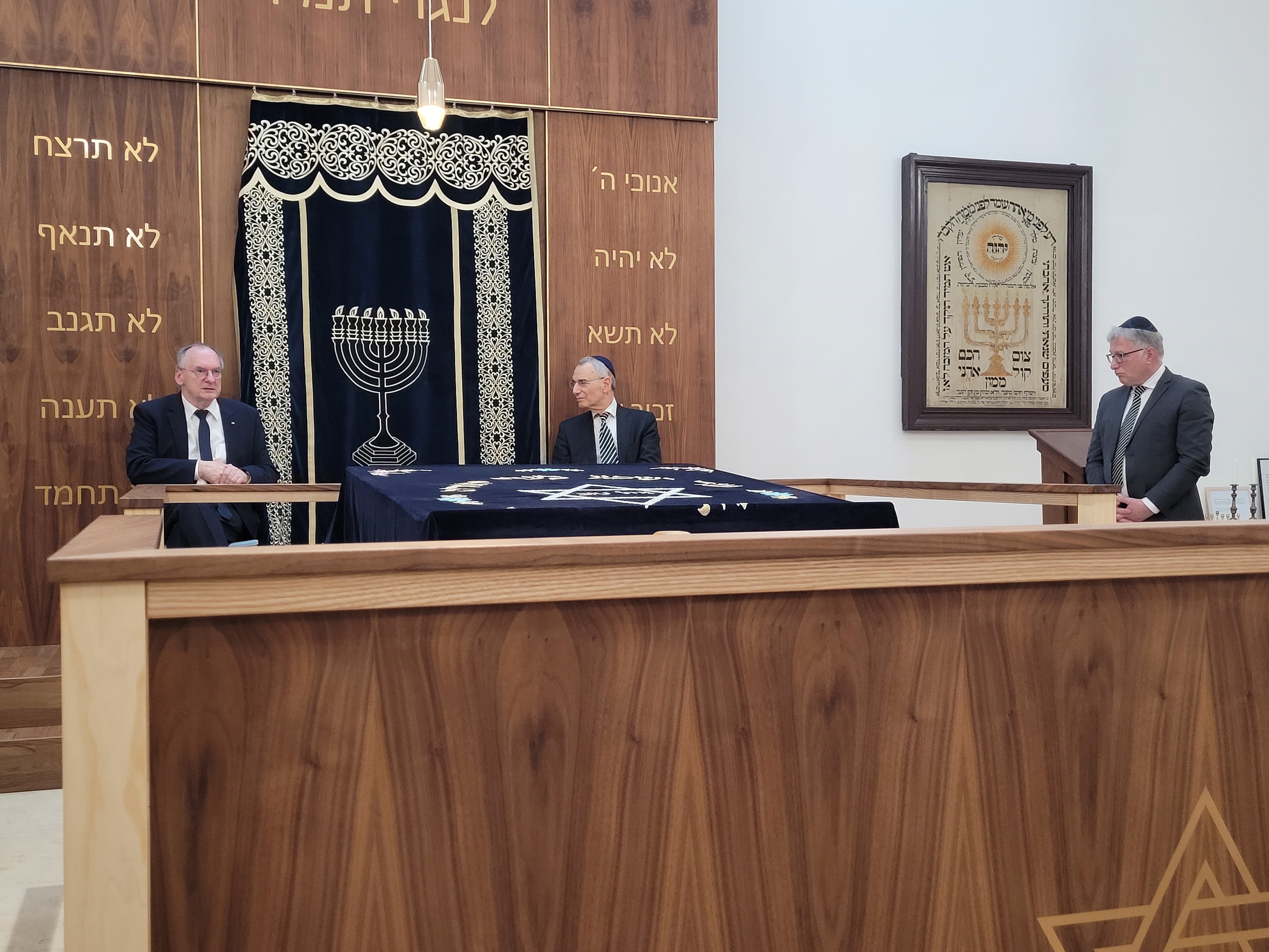 Zunächst empfingen uns sehr herzlich der Landesrabbiner Daniel Fabian und Mitglieder der jüdischen Gemeinde Magdeburg. Herr Fabian zeigte und erläuterte uns das Innere des Gotteshauses und beantwortete die verschiedensten Fragen zum Judentum. Dieser Einblick in die jüdische Religion und das Leben heutiger Juden und Jüdinnen war sehr interessant. Aber gleichzeitig mussten wir auch betroffen wahrnehmen, dass der Antisemitismus und die fehlende Sicherheit ihre täglichen Begleiter sind. Dies zeigt sich u.a. im Synagogenbau. Obwohl das erst 2023 neu errichtete Gebäude sehr ästhetisch wirkt, erscheinen die massiven Sicherheitsvorkehrungen sowohl innen als auch außen auf den Betrachter verstörend.