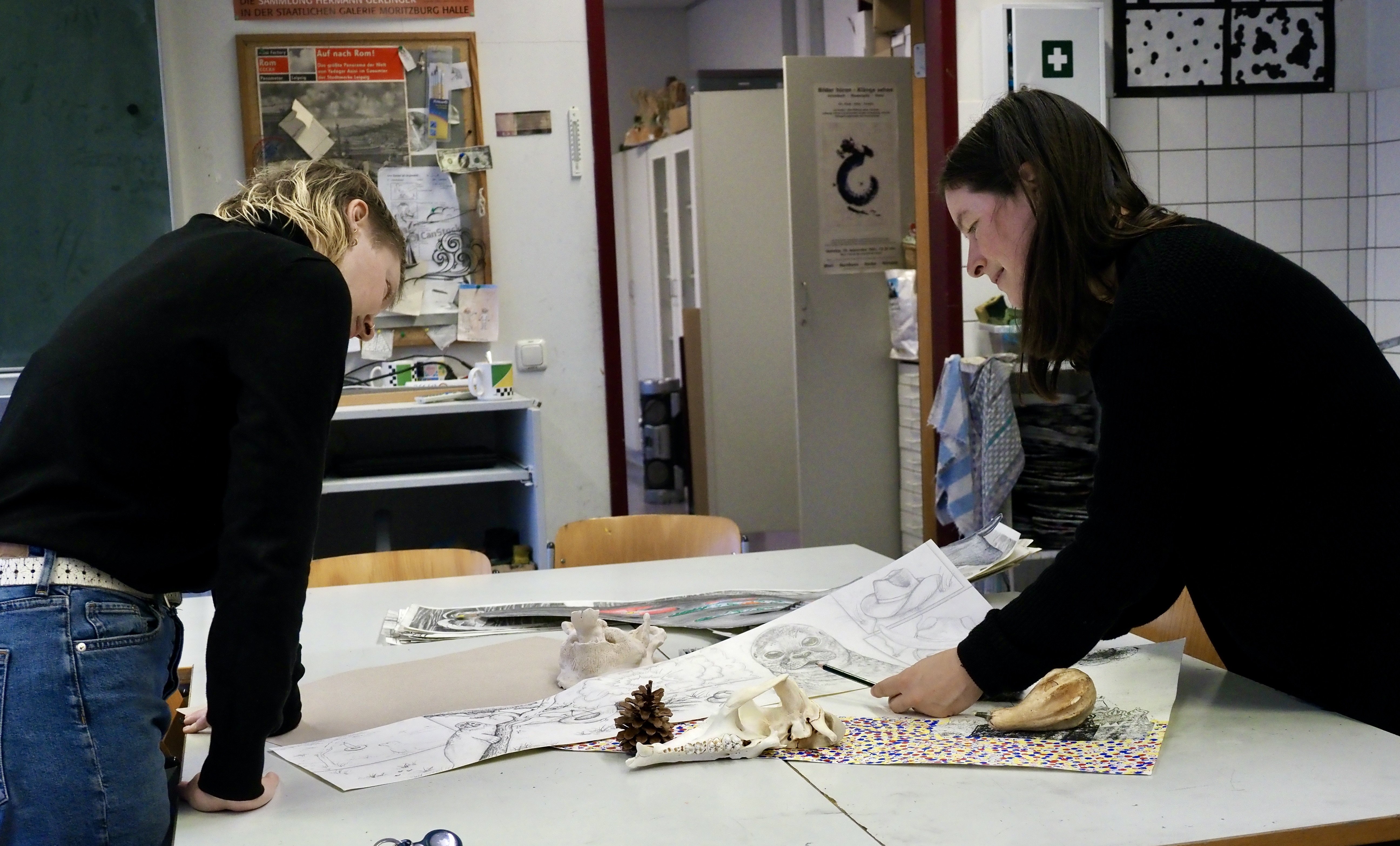 Dafür stehen uns zwei großzügige Kunsträume zur Verfügung, in denen ein Keramik-Brennofen, eine Stockpresse für Hochdruck und eine Tiefdruckpresse installiert sind. Neben einem kleinen Fotolabor für die analoge Vergrößerung von Schwarzweiß-Fotografien kommen auch neue Medien für digitale Arbeiten (Trickfilm, Bildbearbeitung) zum Einsatz.